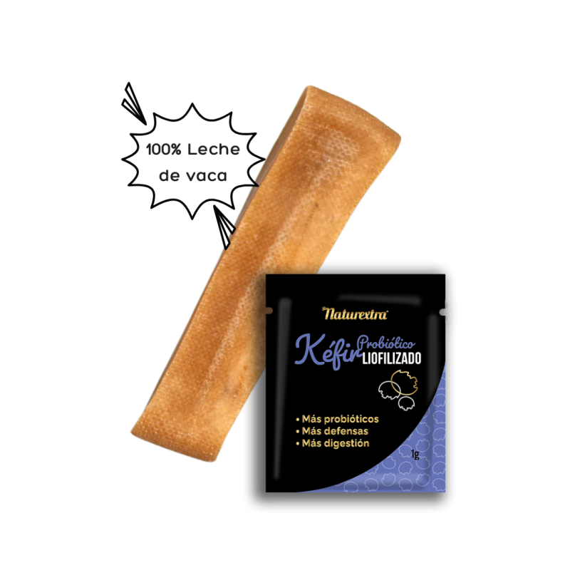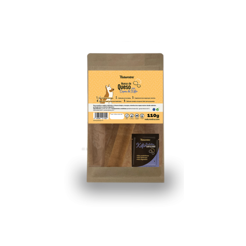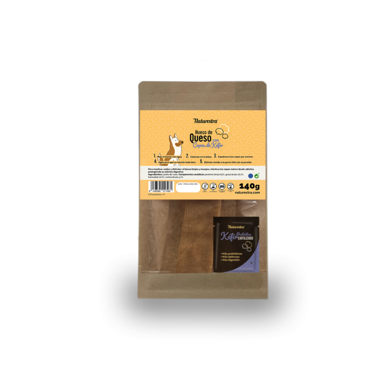 El Hueso de Queso con Kéfir Liofilizado es un snack innovador que combina el placer de la masticación con un potente beneficio funcional. Elaborado con ingredientes naturales, es una excelente fuente de calcio y proteína de alta calidad.