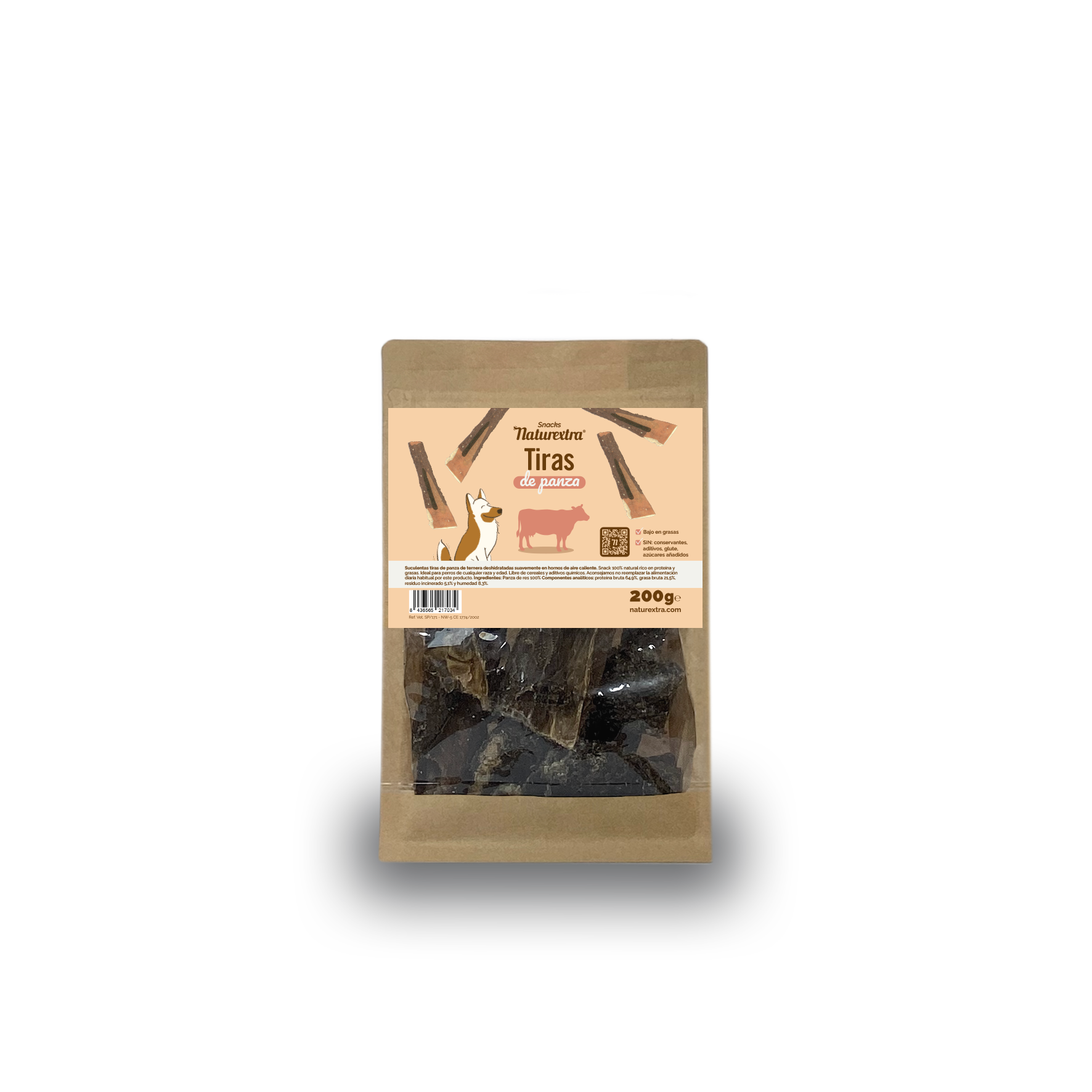 Snack 100% Panza de Ternera (Tripa). Alto en enzimas digestivas y probióticos naturales. Ideal para la salud intestinal y la flora. Sin aditivos, sin gluten, ni cereales. Premio de olor intenso y alta palatabilidad.